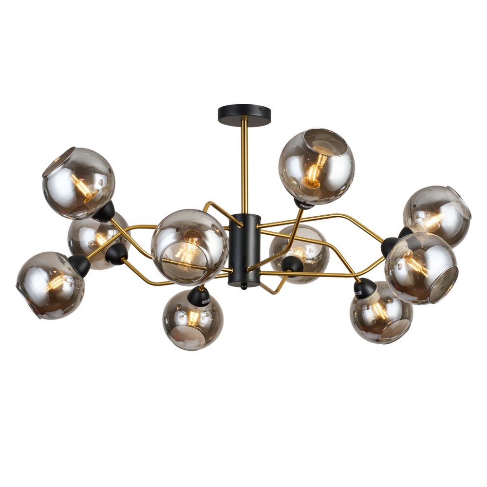 Люстра потолочная на штанге, 10*Е27, черный+медь, плафон серый дым